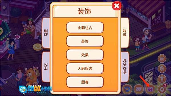 12、点击【信封】图标,就能对全套组合、装饰、效果、大厨服饰以及顾客装饰进行设置,以上便是疯狂大厨的玩法介绍。