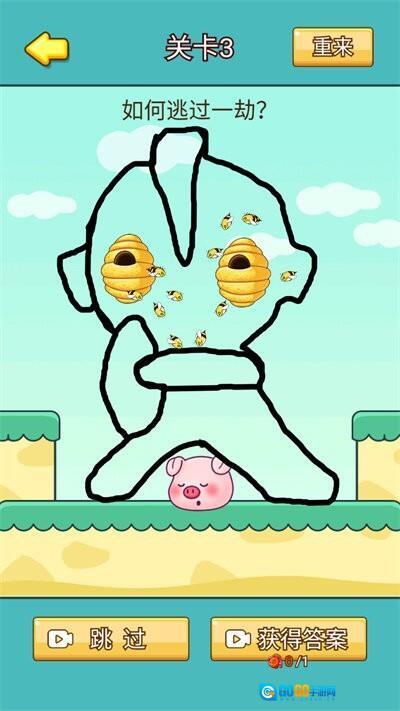 2、按照提示完成操作,每一关都需要动脑筋画线,既要解救小猪又要避开陷阱,尤其考验手速。