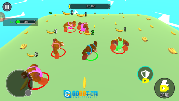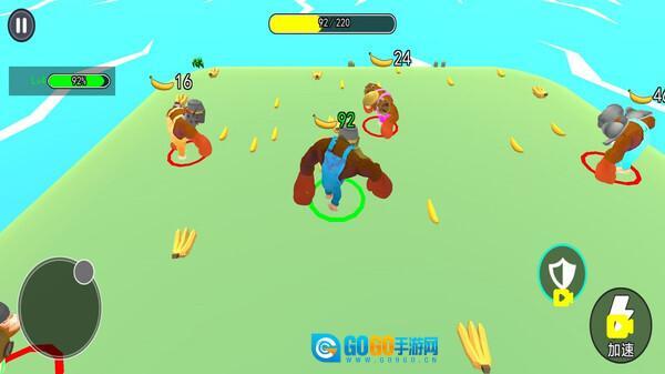 1、玩家要躲避高等级猩猩的攻击,先收集更多香蕉来提升等级,再找合适的时机去攻击其他猩猩。