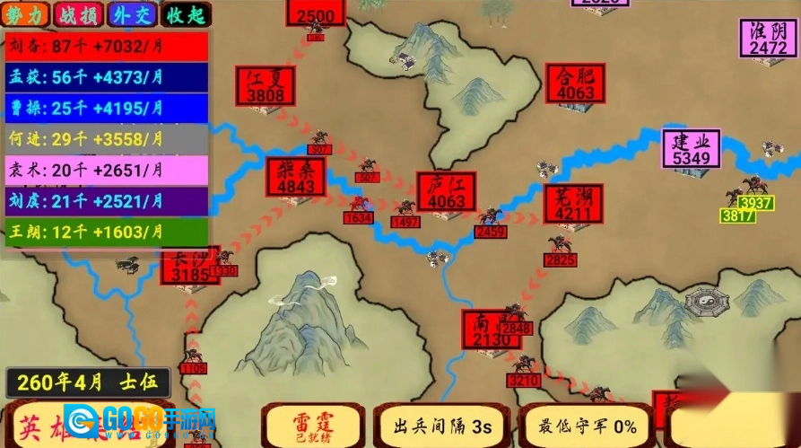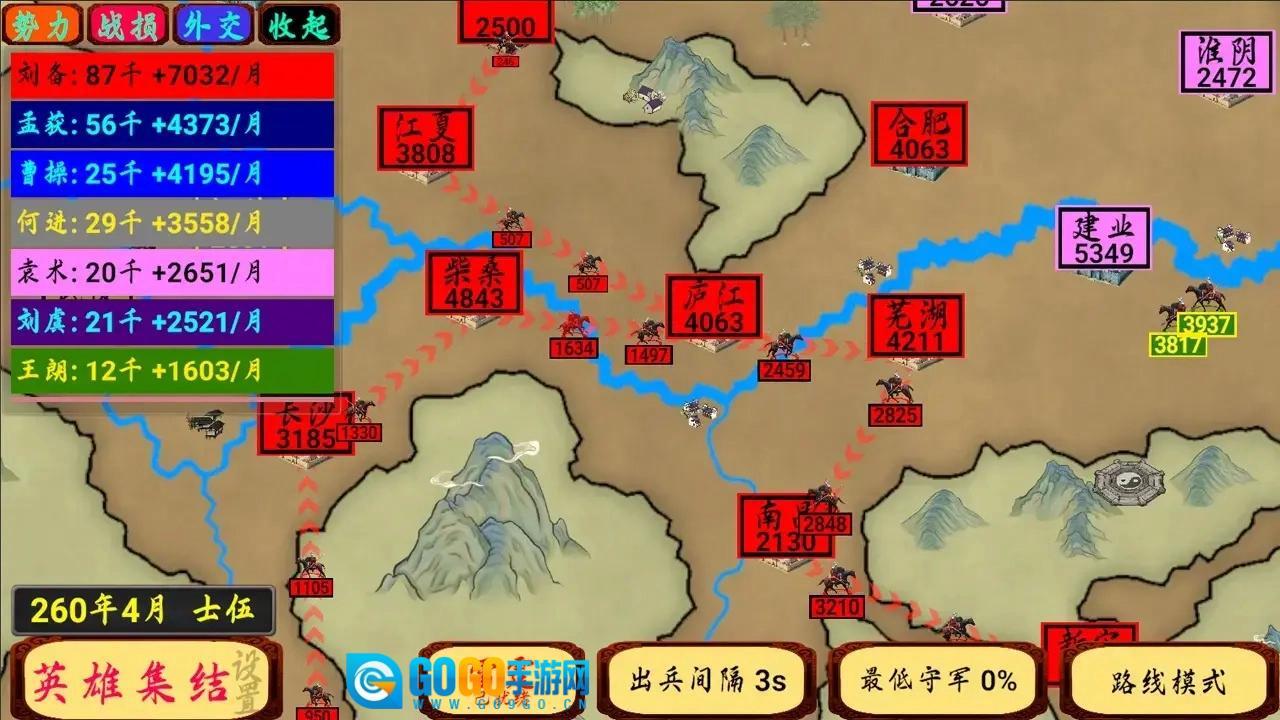 《指划江山》里有多种不同的兵种可供大家挑选,只要熟悉每个兵种的特点并进行合理部署,就能制定出攻防兼备的出色策略。作为一方势力的统领,你最重要的任务就是设法击败另外两方势力,吞并更多的土地,最终成为统一天下的君主!