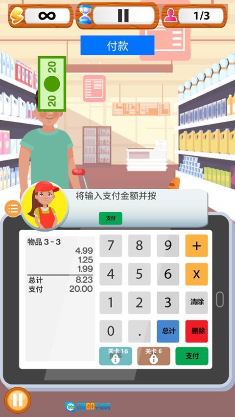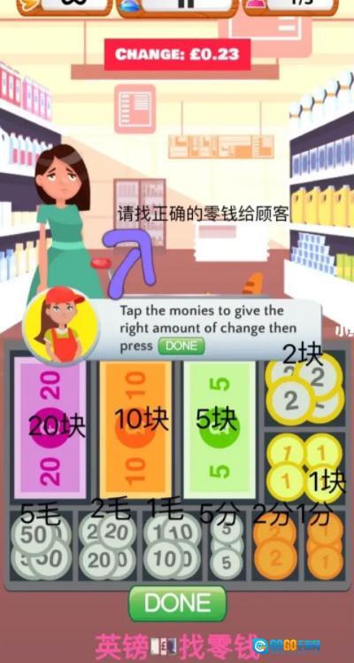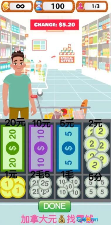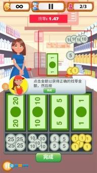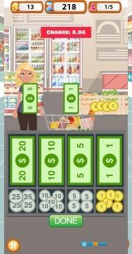3. 挑战自己完成超市收银机的全部关卡,你需要计算零钱并从收银机里获取金币。