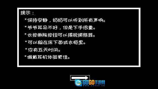 1、一开始你有五天时间用来逃跑,醒来之后,你得去寻找道具,接着到其他房间继续搜寻。要注意,别被奶奶发现了,不然会有危险。
