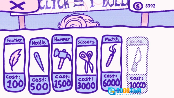 玩家能用赚到的钱购买针头、锤子、剪刀之类的物品,这些物品能提升每次点击的收入,比如可以达到2美元、4美元、8美元这样的数值。
