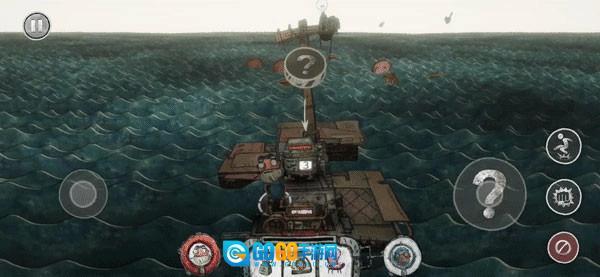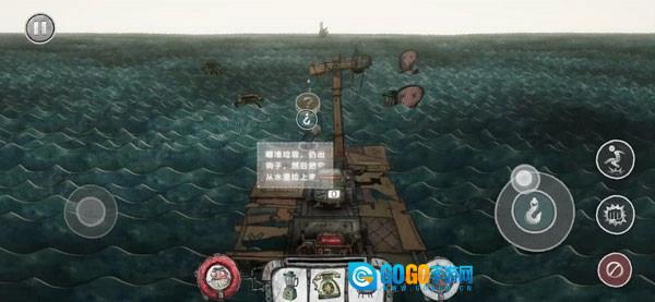 控制人物移动到木筏前端,右边的操作集合按钮就会变成鱼钩,通过辅助线引导,来钩取自己想要捡的垃圾。