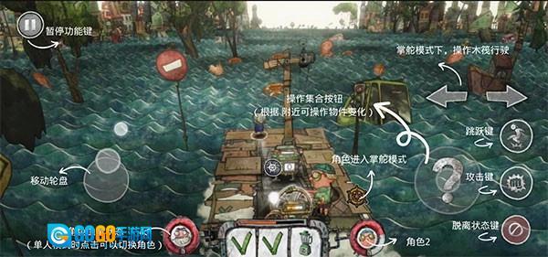 游戏目前有很多玩法,例如捡垃圾、打怪、开船、修船等,而且单机模式下还支持一个人控制2个角色,所以按键分布比较丰富。