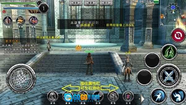 2、角色移动由屏幕左侧控制,攻击、跳跃、闪避及技能按钮分布在右侧。快捷栏可通过右上角进行切换,状态、装备、技能等功能按键设置在下方,功能面板能够左右滑动查看。点击“状态”就能打开角色属性详情页