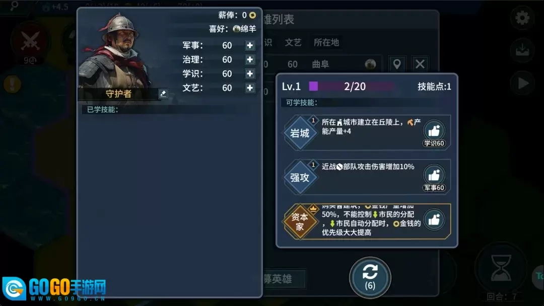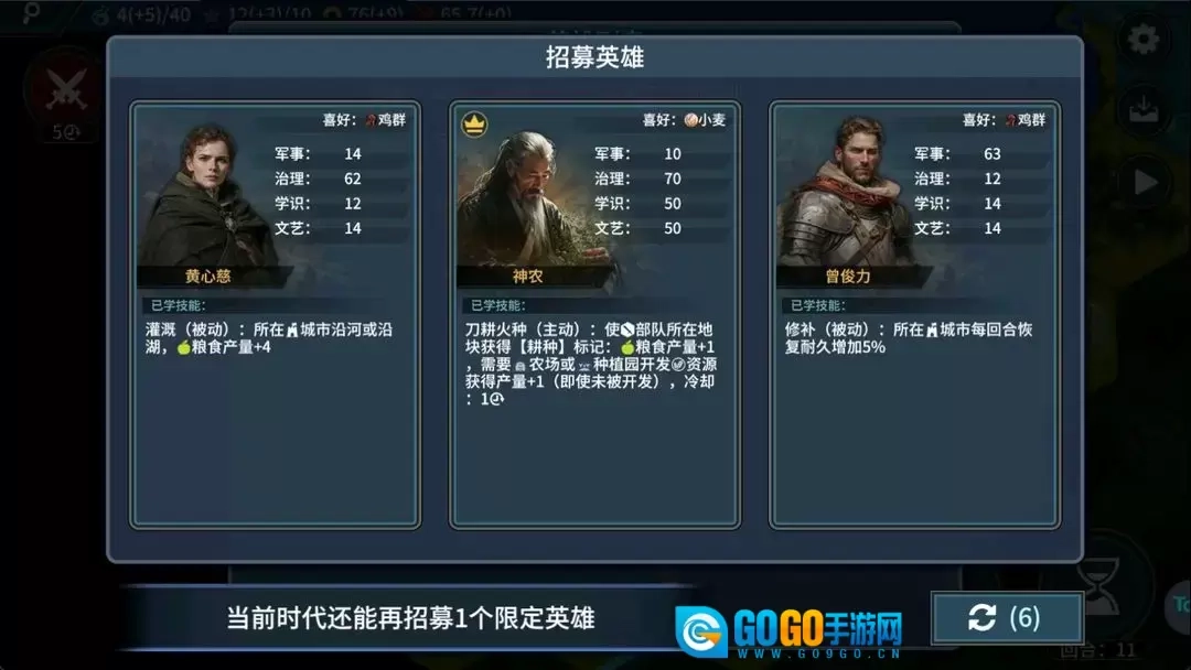 3、神农可修习育林之术,李白与瓦特能学习采集技能,其余的技能栏位可预留用于军事相关的技能。