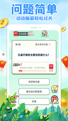 1.每答对一道题目都能领取红包奖励,持续解锁更多关卡,就能获得更多红包奖励。