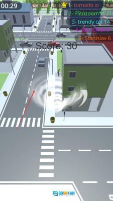 1、操纵小龙卷风在街道场景里启动移动,当遇到路边的垃圾桶、小石块这类物体时,靠近它们就能让这些物体被卷入其中,龙卷风的体积也会随之逐渐增大。
