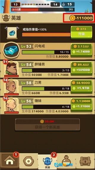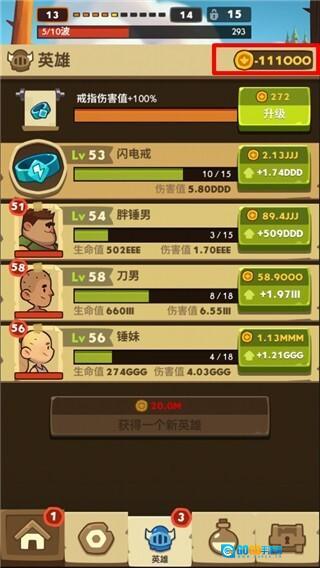 2、除了所操控的角色外,玩家自身还能控制一枚神戒发起攻击(操作方式依旧是点击),神戒具备不同属性(初始阶段只有雷属性),也可以用游戏里获取的金币来提升等级。因为处于上帝模式,持有神戒的你永远不会受到伤害,但你的英雄却很容易被怪物包围攻击。不过无需担心,就算那些不太聪明的英雄全部阵亡,你仍然可以借助戒指继续攻击。并且在经过一定的冷却时间后,你的这些英雄们都会复活,而且是无限次复活哦;