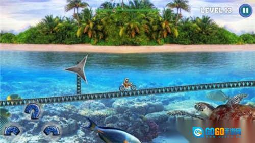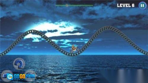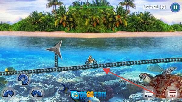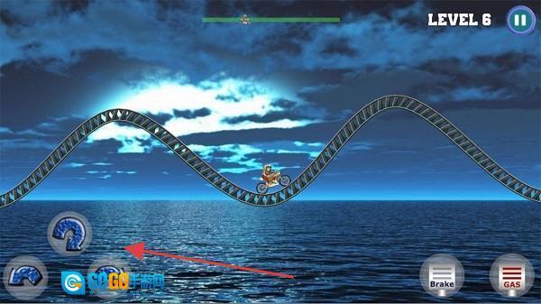 2、在海洋与海岛的赛道场景中,借助“Gas”按键实现加速、“Brake”按键完成减速,同时控制摩托的平衡状态,顺利通过环形轨道与波浪形轨道。
