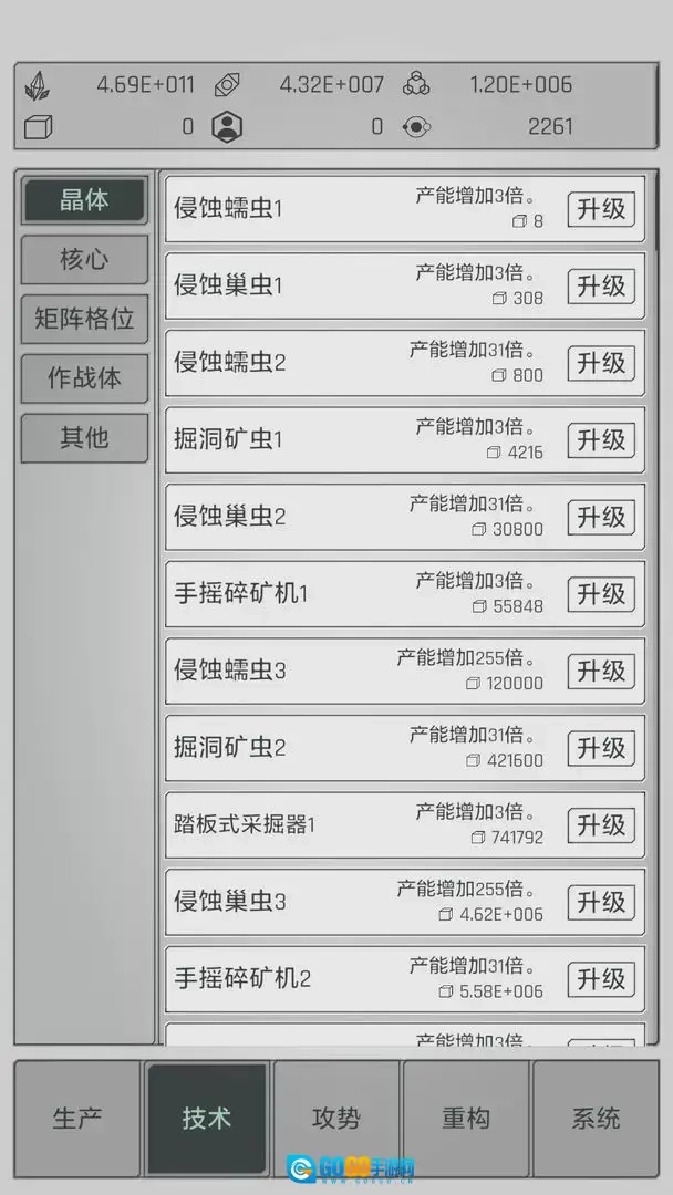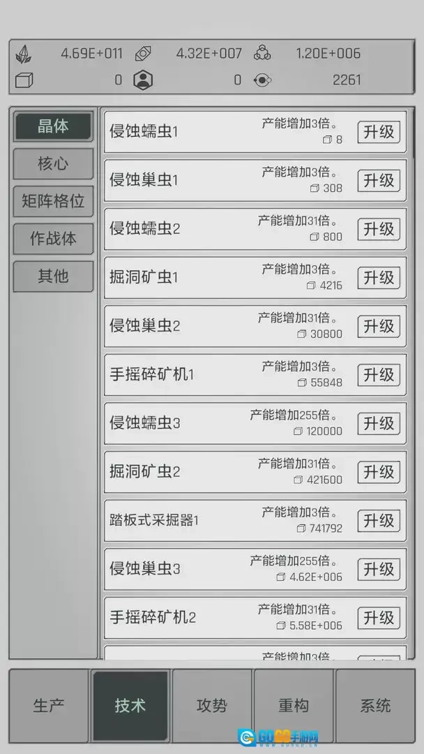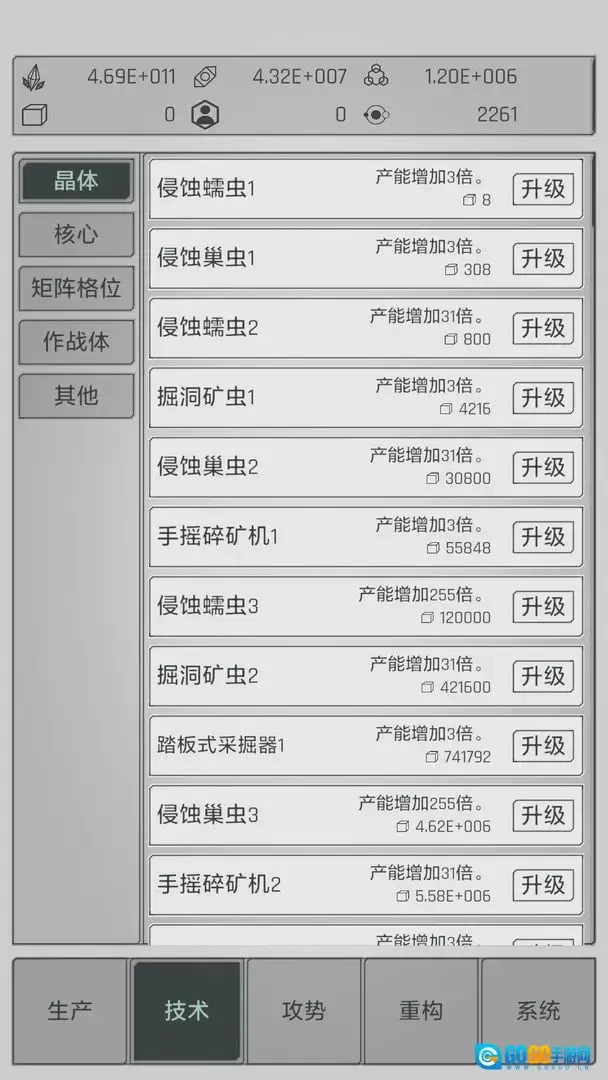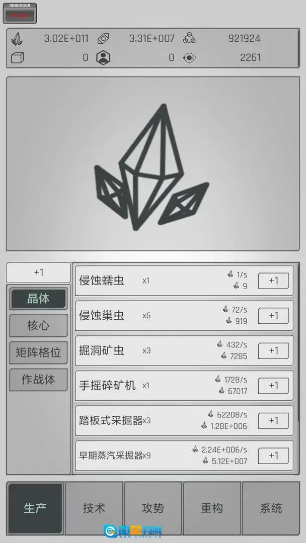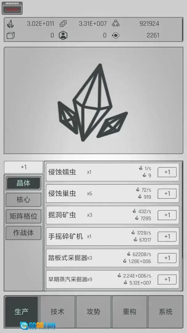 点击水晶可获取基础资源,解锁新技术能提升产量。积累金属资源后进行重构,可进一步提高产能。