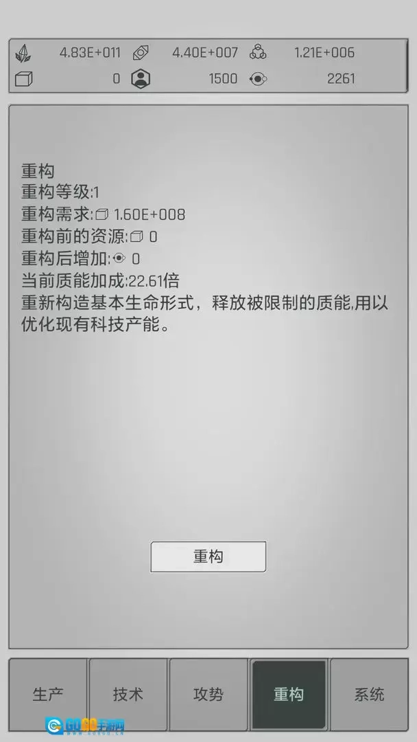 游戏里的重构系统效果十分显著,重构次数越多,倍率数值就会越高。建议玩家尽量快速提升倍率,通常来说,重构倍率只要达到5次,强度就足以轻松通关。哪怕只进行一次重构,游戏难度也会大幅下降!