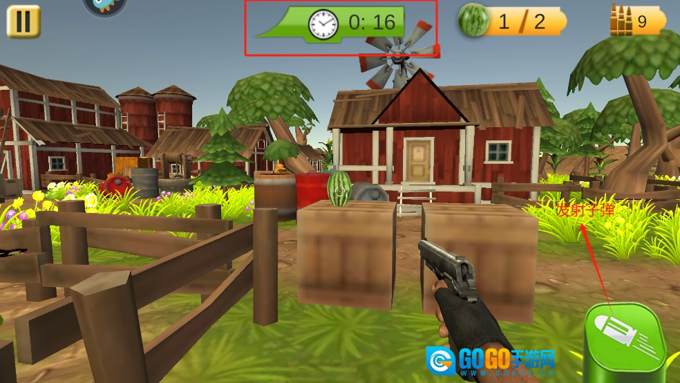 3、留意游戏里的倒计时,借助左侧操控手枪的移动方向,再用右侧发射子弹去击中目标。