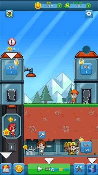 1、首先根据新手指引点击地下矿中的穿黄色衣服的矿工,然后他会进行挖矿,挖好矿后会背到左边靠近电梯的小箱子里面,这时点击在电梯中的红色衣服矿工,他会把箱子里面的东西传送到上方机器里面,然后点击在地面推小车的红衣服矿工,他会推着小车到机器下面接金币,送到原地。这三个矿工的规律性比较强,下面黄色的矿工可以一直进行挖矿,然后电梯里的矿工只需要吧挖好的矿石进行往上运送即可,地面上的工人,在机器下接住矿石推回原地就可以获取金币。