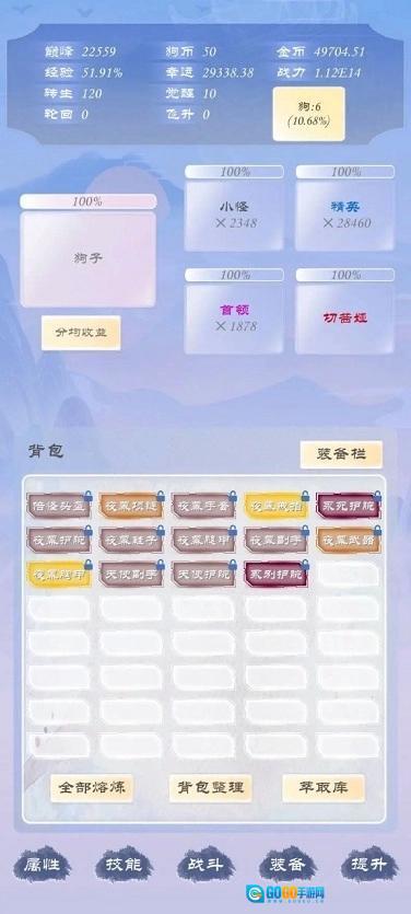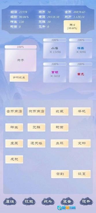 刚登场只能打过一级怪,游戏的主要流程都在下面的提升里,几个境界,宠物,塔,魔王都在这个界面