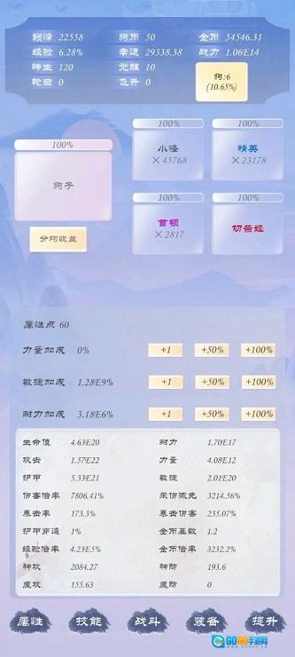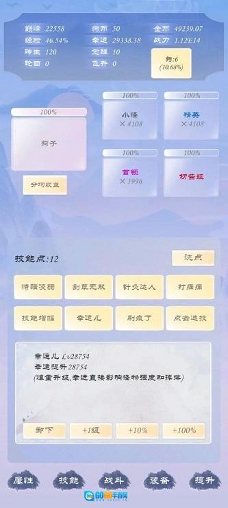 下一个阶段开始点幸运,憋属性,点一级神器伏羲琴准备转生,幸运增加怪物数量,可以平衡幸运与难度获得最高的经验,等级一百之后准备下一步