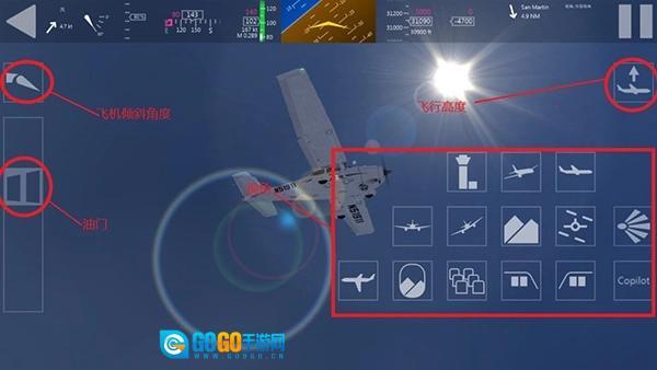 玩家进入游戏之后可以看到左右两边有控制按钮,左边是飞机倾斜角度以及油门,右边可以调节视角和飞行高度。