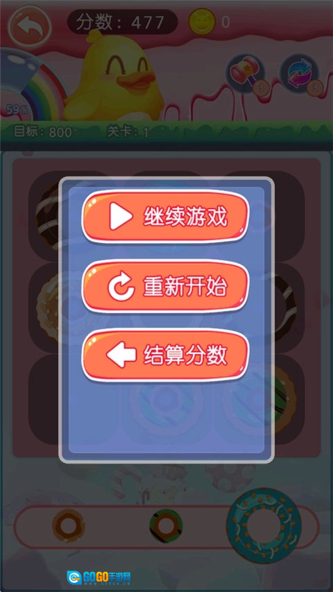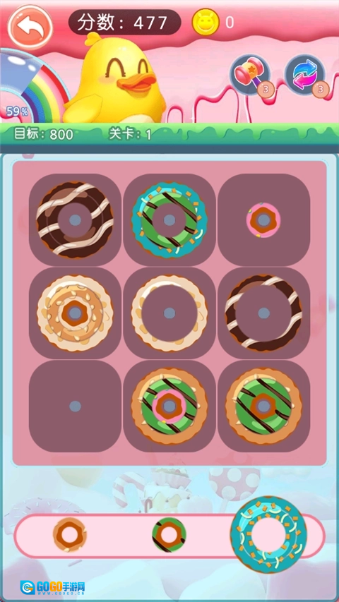 游戏中有各种颜色和形状的甜甜圈,增加了视觉吸引力和趣味性。