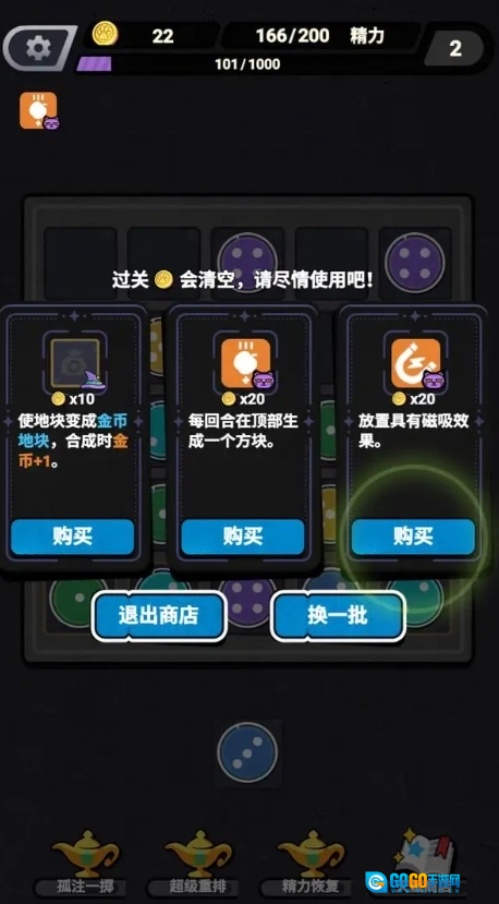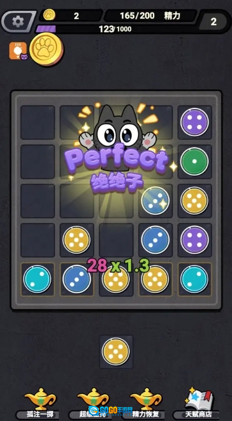 规则简单易懂,单个1挨一起变成2,以此类推,到三个6合成后就会消除。购买增益道具后,相同点数的棋子会吸附过来,消除变得更简单,即便堆乱一些也没关系。金币是非常有限的资源,在消除过程中尽可能多的占据点位消除,是消除策略的主要方向。