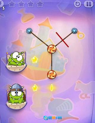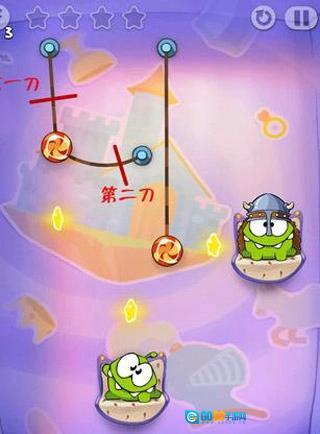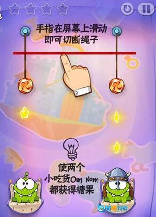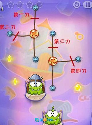 第四关:先竖直切开左边的糖果,吃到星星后再切断最左侧的线;右边的绳子操作方式相同。