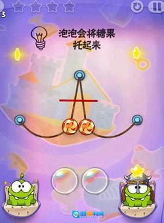 第五关:首先同时剪断中间的两条线,让糖果碰到泡泡后飞起来,等它到达顶点时,再剪断绳子并同时戳破泡泡就可以了。