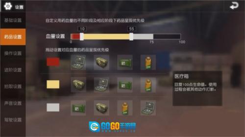 3、药品设置方面,你可以依据自身的分析,把它设定为三个阶段。在对应的阶段,系统会自动弹出相应的药品。这种自动弹出的功能,能帮你省去在背包里翻找药品的时间。不过需要注意的是,这个设置可能存在一定风险,建议把数值调高一些。毕竟如果只是在前往演习信号接收区的途中掉血需要补充,其实也不会太在意去背包里手动补药。