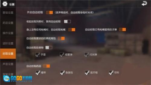 6、自动拾取功能,通常建议开启枪械和药品的拾取,其他物品可根据个人偏好选择,并非必需开启。