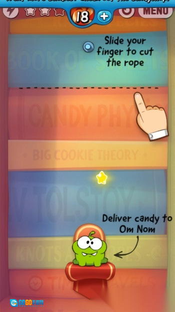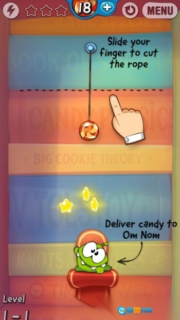 4. 玩法很简单,只需切断绳子,就能让糖果落入OMNOM口中。