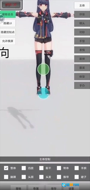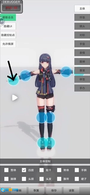 3、点击四肢,角色模型上,青蓝色的球可以控制四肢的移动。