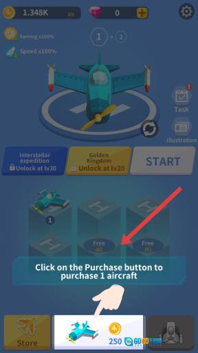 进入游戏后,按照系统给出的指引操作,找到底部的购买区域,花费250金币购置一架同类型的蓝色战机,以此增加战机的储备数量。