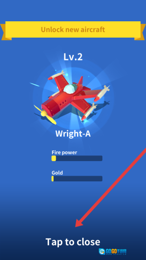3、解锁新战机后,点击界面底部显示“Tap to close”的提示文字,关闭战机属性展示的弹窗,回到原界面继续后续操作。