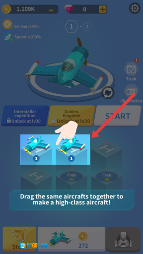 2、拖动2架同型号且显示等级为1的蓝色战机进行合并,能够合成更高阶的战机Lv.2Wright-A,从而提升战力。