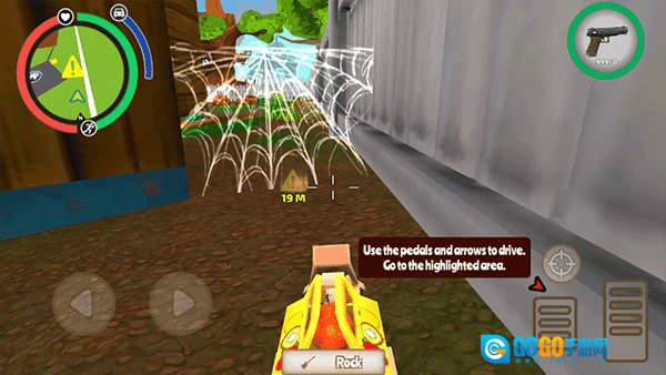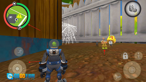 3、左侧的陀螺仪用于操控角色移动,左上角显示的是地图,通过它你能清楚了解自己当前的位置,以及需要前往的目标点,目标点距离你16米。