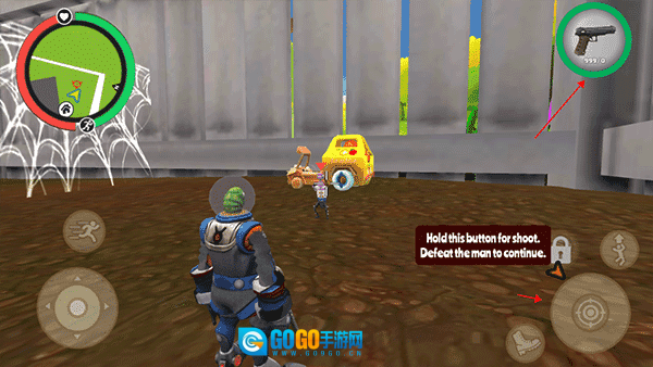 4、接下来你需要消灭它们,你会按照提示装备武器,然后点击右下角的攻击键来击杀那只紫色昆虫