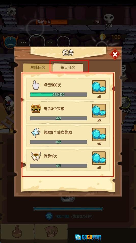 4、打开任务界面查看每日任务,比如点击指定次数、击杀宝箱这类任务,完成后能获取蓝色水晶等奖励,为冒险提供助力。