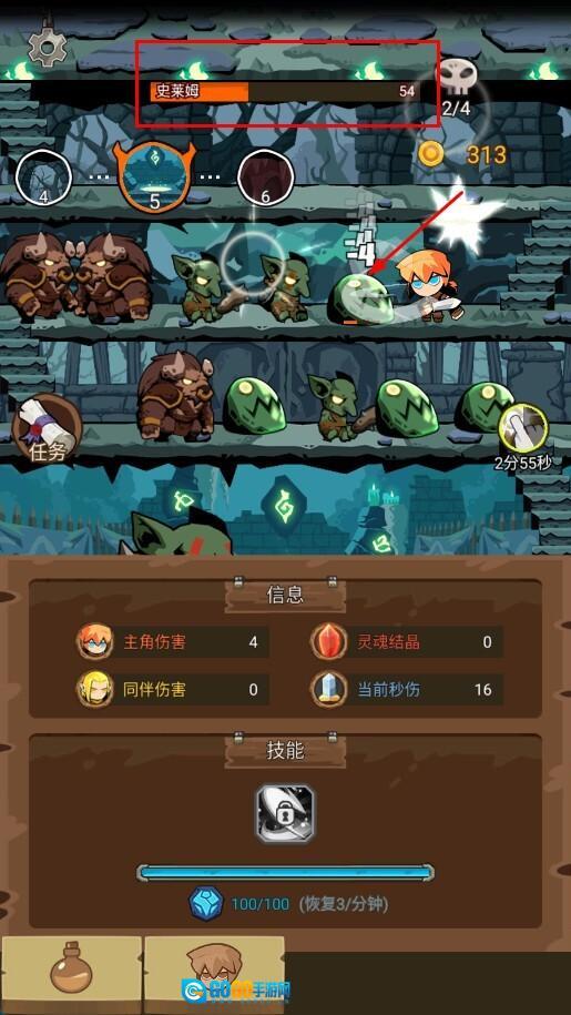 1、进入地牢战斗场景后,玩家可以操控角色对史莱姆等敌人发起攻击,战斗过程中能清晰看到角色每次攻击造成的伤害数值,持续攻击即可将敌人击败。