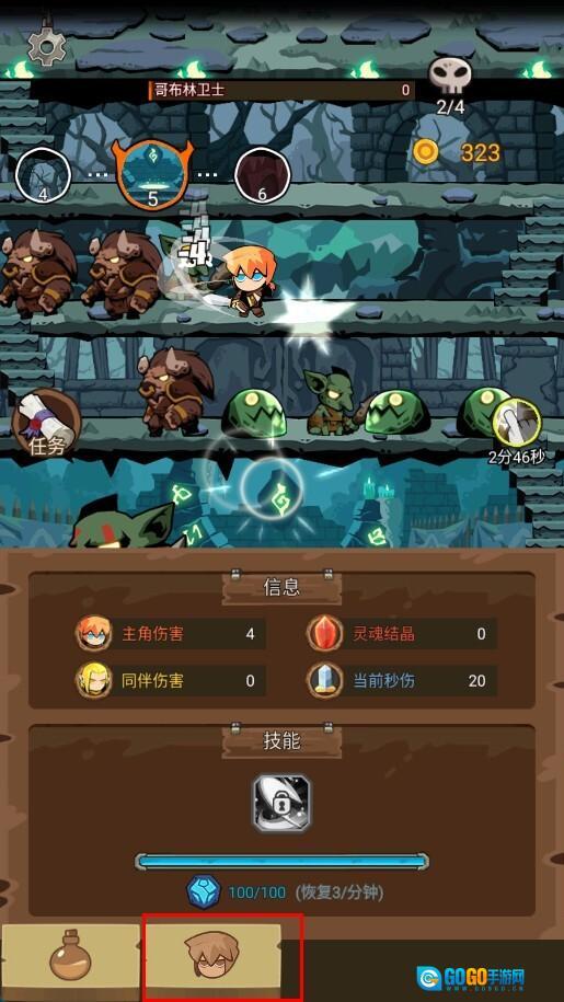 击败史莱姆之后,会遇到哥布林卫士这类新敌人,此时点击下方的角色相关按钮,为提升角色属性做准备,以便继续在地牢中战斗。