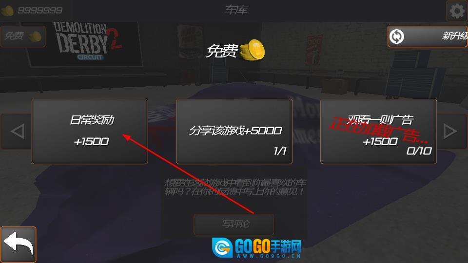 1、进入车库界面后,点击日常奖励按钮领取1500金币,这笔金币可用于车辆升级等资源积累,以此开启游戏内的资源获取流程。