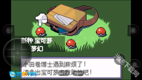 4、接着你会发现发出求救信号的是小田卷博士,一番交流之后,他会让你从前方的背包里挑选一只宝可梦。由于这是网友自制的游戏,我们能选的初始宝可梦都是实力强劲的神兽,分别是梦幻、雪拉比和基拉祈,选哪一只都没有问题。