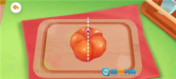 2、按照提示操作进入后,拉动屏幕里的虚线,把西红柿切开。