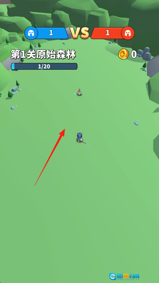 2、在战场(红箭头所指位置),控制士兵移动并靠近敌方(红色标识)单位,系统会自动触发战斗,以此推动关卡进度(当前进度为1/20)。