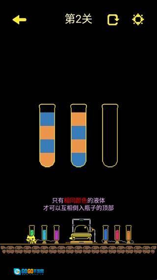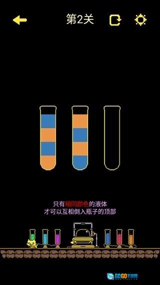 2、古墓补给站,需将瓶子里的颜色进行分类,唯有相同的颜色才能相互倒入。