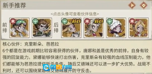 介绍:这6个都是在游戏前期比较容易获得的伙伴,唐娜和盖是优秀的前排,自身有较强的回复能力。黛娜能够快速打出伤害,克里斯朵有较强的血线压制能力,他们都能够为芭芭拉提供斩杀条件,随后艾德琳还可以进一步扩大优势。战局不利时,还可以围绕黛娜和艾德琳展开防守反击。