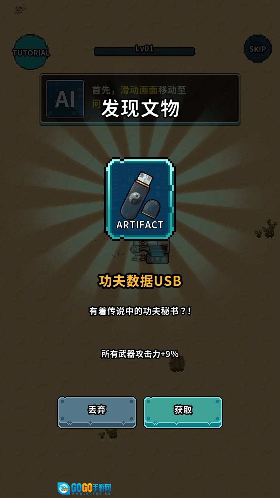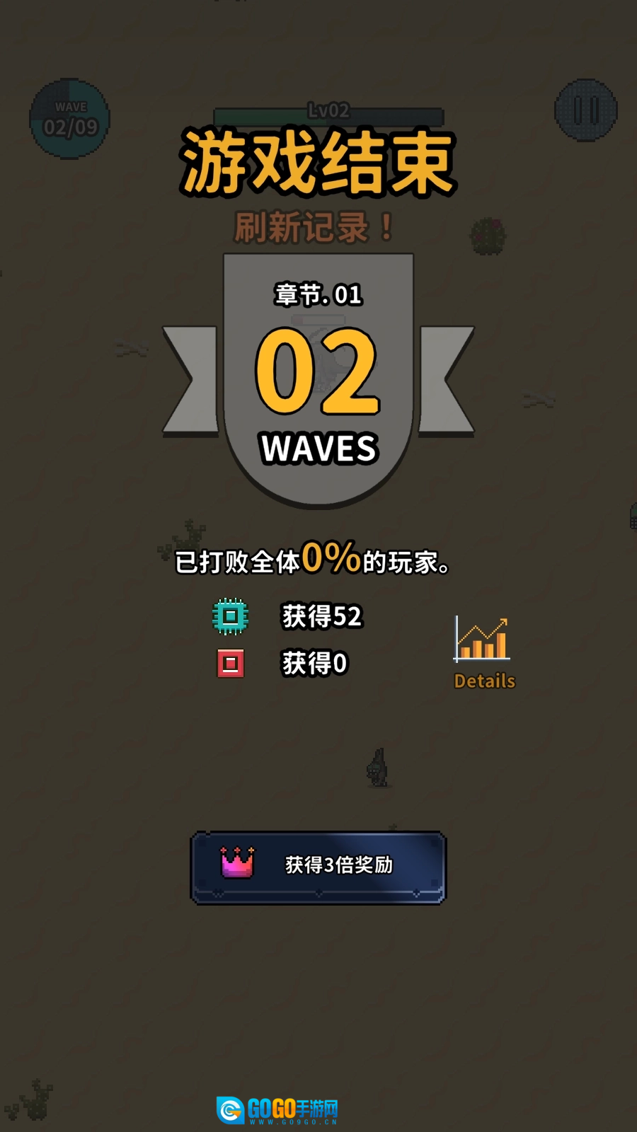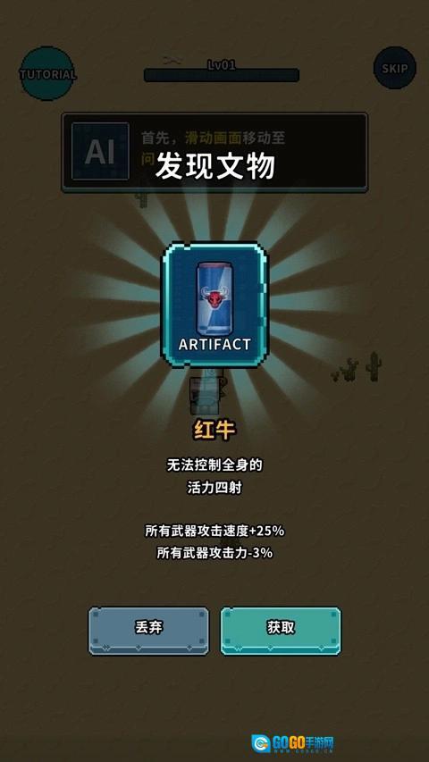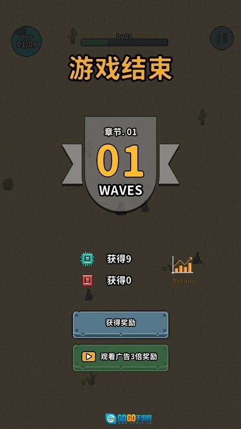 7、如果不小心被怪物击杀则导致游戏结束,可选择复活或者直接获得奖励,然后升级武器和装备后再次挑战。