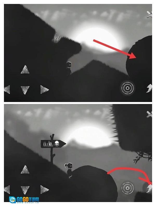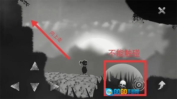 ①跳跃躲避路上的小骷髅,继续向左走至大球旁。