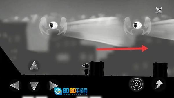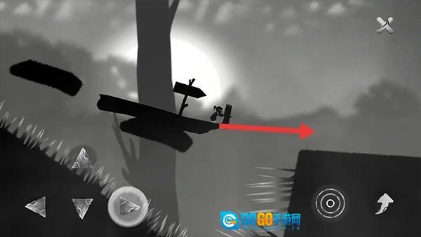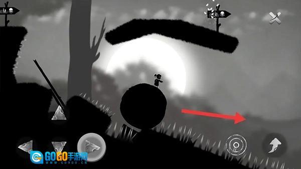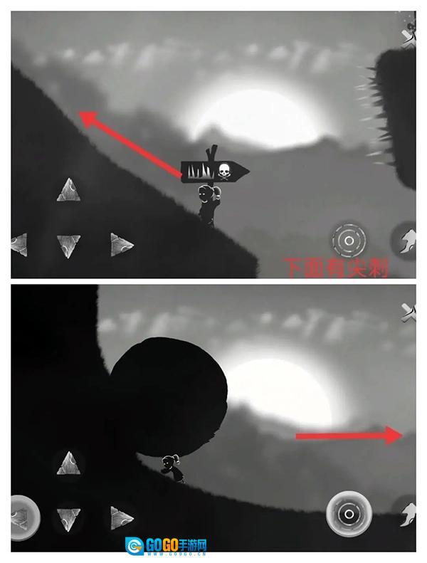 ④右走至悬崖边会出现死神。向左跑,躲避尖刺的同时注意不要被死神抓住