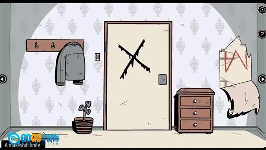 8、用钥匙打开抽屉拿走手套,割开右边墙壁纸,打开封住的柜子获得钥匙和开关。