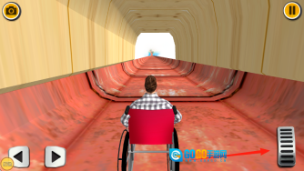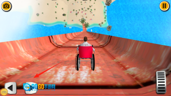 1、控制轮椅,顺着箭头指示的方向,从坡道滑行而下,进入管道,要留意保持平衡,沿着轨道向前行进,避免翻车,推进至下一个关卡。