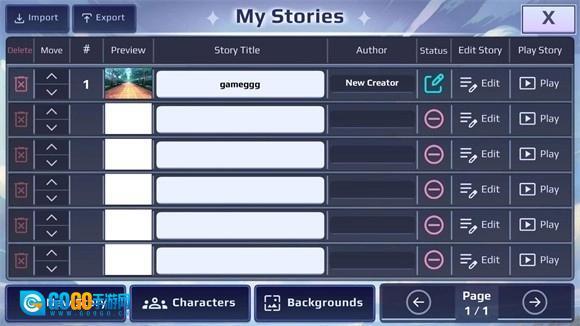 1、进入游戏后,点击主界面的“newstory”即可开启故事创作。创作前,可在“角色”“故事”板块查看游戏素材,同时也支持玩家自行上传素材。